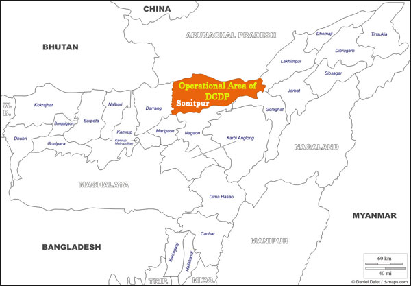 The intensive action area is stretched in 47 villages encompassing 2 Blocks in the District of Sonitpur. It has a wide networking through the District with Bheluadanga under the Chaiduar Development Block of Gohpur Sub Division and Selaikhati Area Development Committee under the Biswanath Development Block of Biswanath Sub Division.